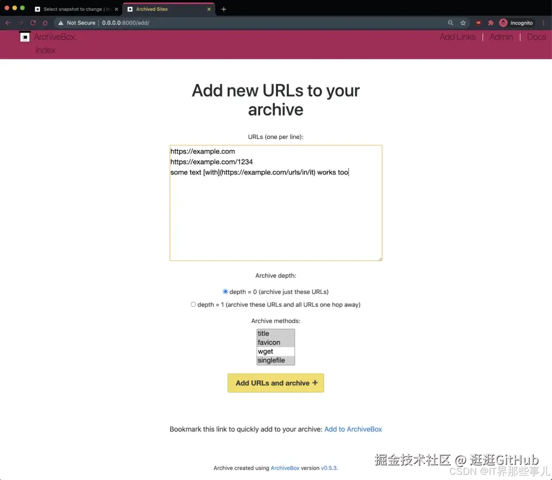 可以直接通过 pip 安装 archivebox,当然还支持 Docker 啥的,可以直接去 readme 看看。