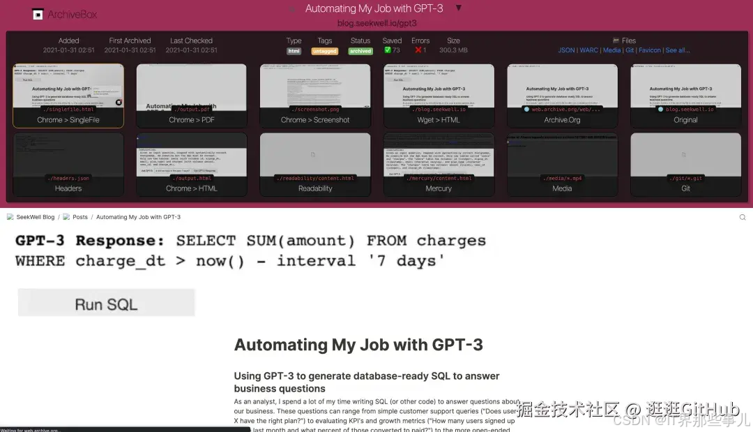 不管是浏览器书签、浏览记录,还是 Pocket、RSS 订阅里的链接,都能交给它备份,而且会存成 PDF、截图、纯文本、HTML、MP4 啥的格式。