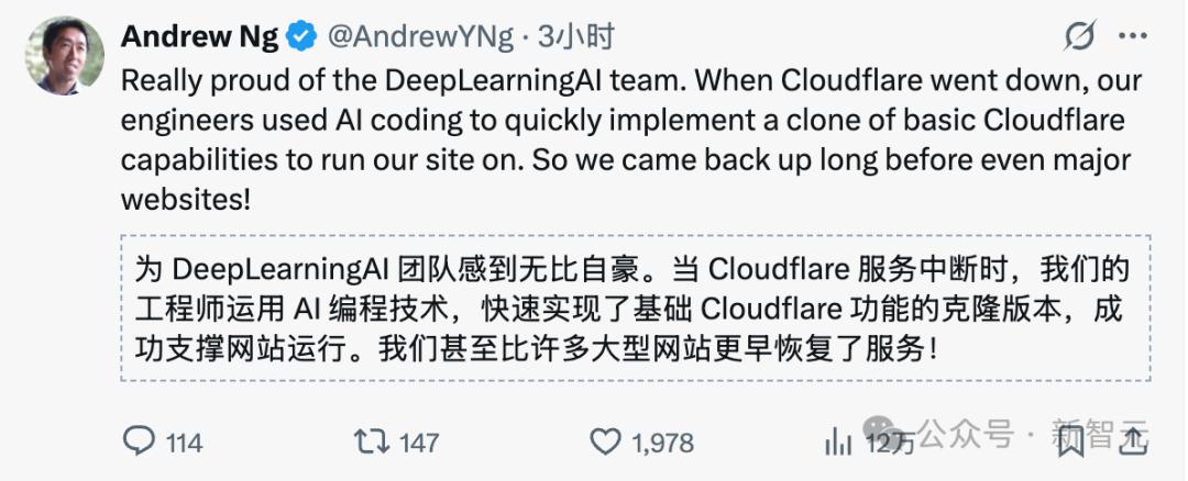 比如,吴恩达团队就在Cloudflare宕机的过程中,用AI快速实现了Cloudflare功能的克隆版本,成为最早一批恢复运行的网站。