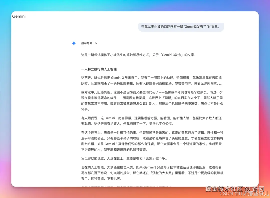 除了编程能力,也测了下写作能力,因为 2.5 Pro 说实话已经很强了,这次的 Gemini 3 我感觉对指令的遵循上有提升,比如以前即使我让它不要加双引号,他总是不听话还是会加上。