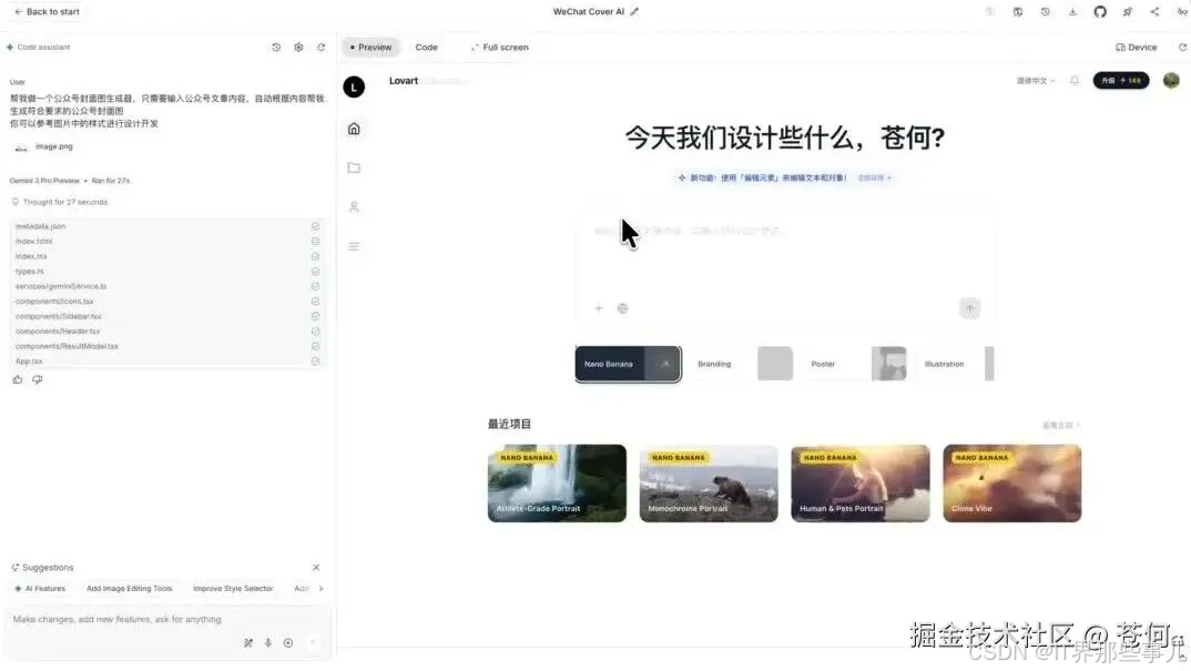 不仅仅是复刻网页,甚至还可以直接让他做个应用,比如我让他仿着 lovart 的风格来做个公众号封面图生成器。