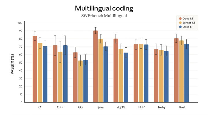 Opus 4.5 的代码质量全面升级,在 SWE-bench Multilingual 涵盖的八种编程语言里,它在其中七种都拔得头筹,表现相当亮眼。