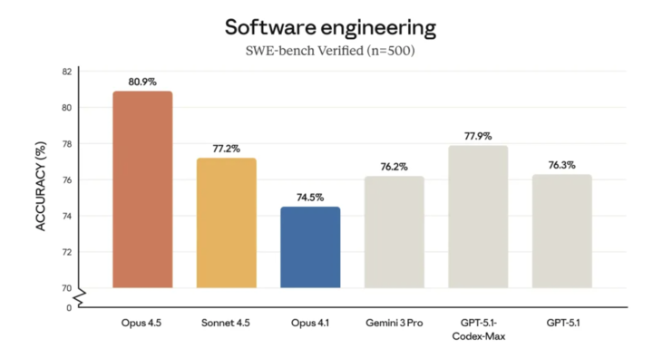 在真实场景的软件工程测试 SWE-Bench Verified 里,它是头一个拿到 80% 以上分数的模型。