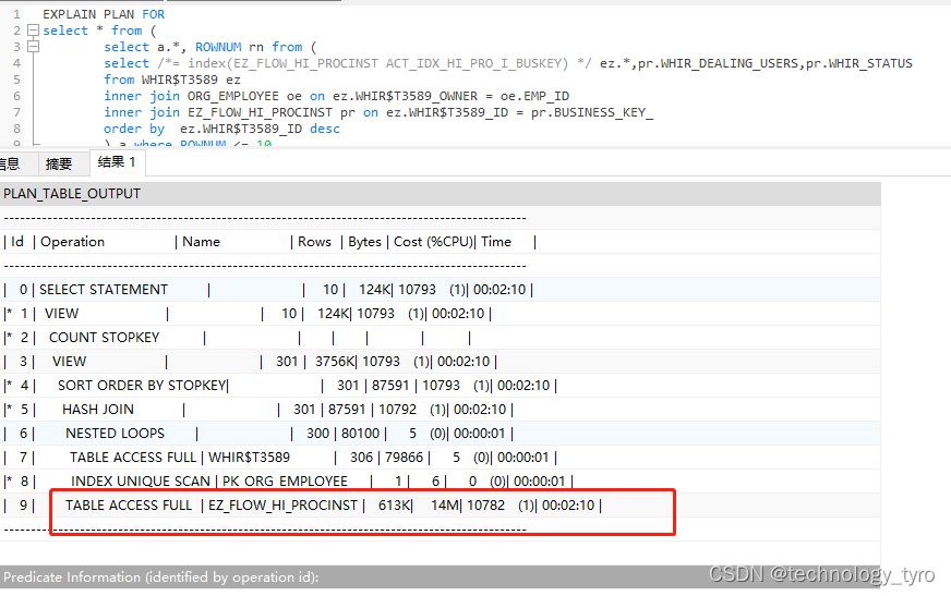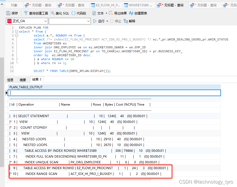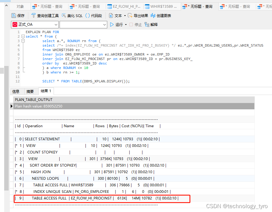 注:由于sql使用函数的列不能使用索引,所以必须将使用转换函数的列设定为小表,WHIR$T3589只有300多条数据,所以使用TO_CHAR(ez.WHIR$T3589_ID)转化小表的字段