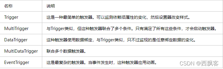 触发器通过Style.Trigger集合链接到样式。每个样式可以有任意多个触发器。每个触发器都是System.Windows.TriggerBase的实例。