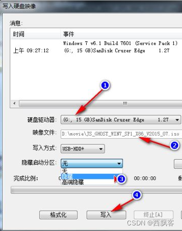 4、在弹出的页面中,确认“硬盘驱动器”是否为当前U盘,写入方式USB-HDD+,另外可选择是否“隐藏启动分区”,选择无,确认后点击“写入”。