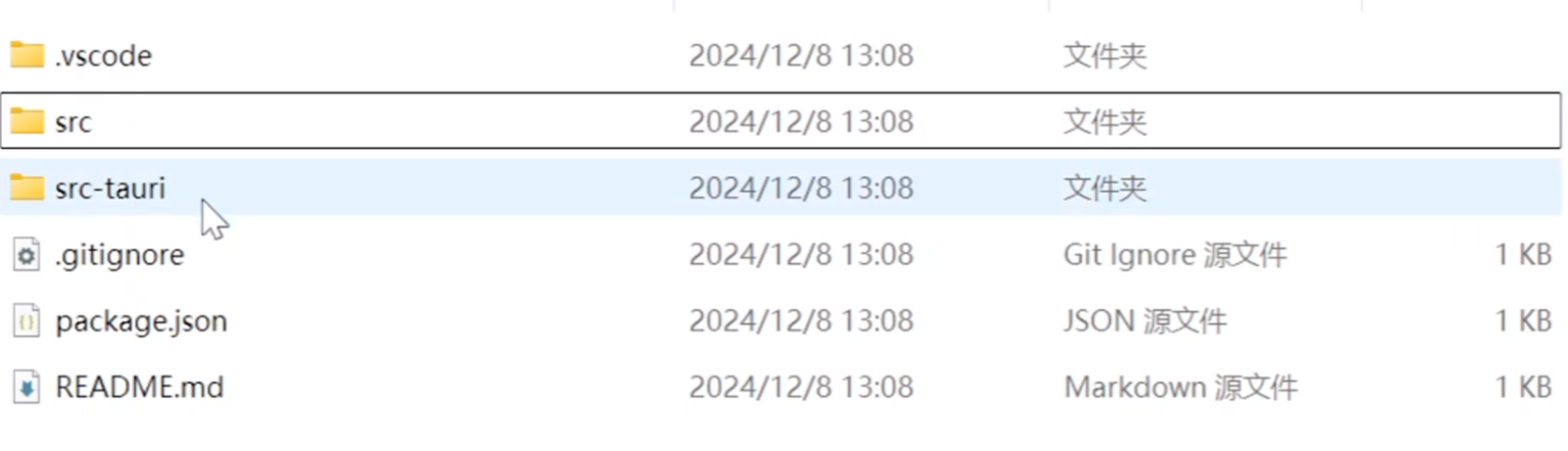这样桌面就多了一个文件夹,我们打开看一下。这个文件夹就是Tauri的一个工程,我们可以看到这里有两个src文件夹: