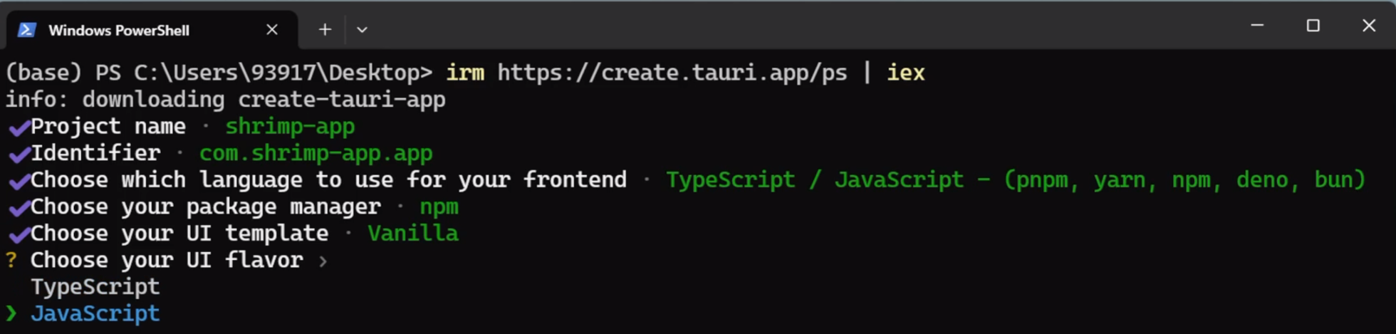 - 接下来选择一个前端编程语言,这里我选择JavaScript/TypeScript。我们可以注意到,在2.0版本,Tauri不止可以选择JavaScript,也可以选择Rust或者.NET作为前端的编程语言。
