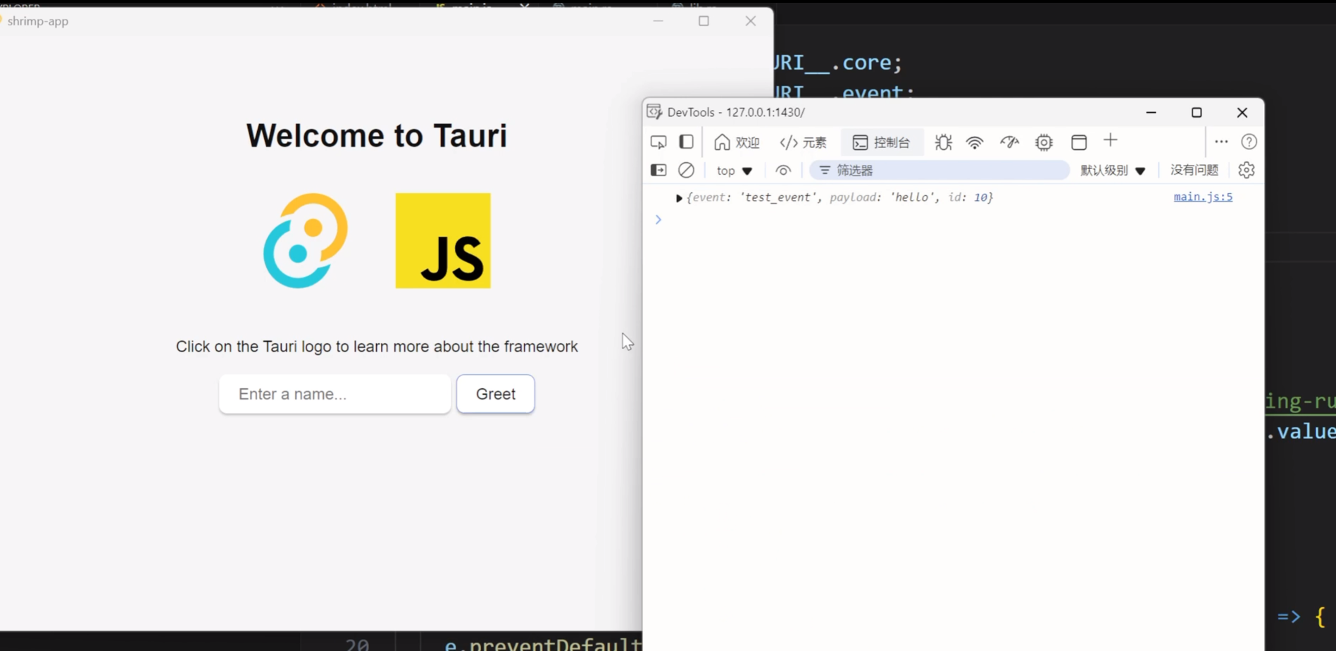 接下来我们写一个listen方法,这个方法监听了一个叫做test_event事件,也就是后端这里推送的这个事件的名字。接下来我们写一个回调函数,监听到事件以后,我们把事件里面的payload打印出来。好我们保存一下,最后一步,我们把调用按钮的事件改成greet2,也就是它调用后端的这个greet2方法,推送消息到前端,最后前端监听一下,打印出来。
