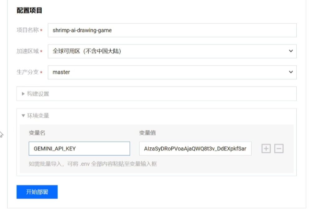 如果您有备案域名的话,加速区域可以选择全球可用区(含中国大陆);没有备案域名的话,可以选择全球可用区(不含中国大陆)。接下来我们填写环境变量,我的这个程序只需要填写一个Gemini的API密钥,我把它复制一下,填写过来。点击开始部署。