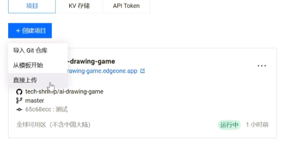 我们把它部署到EdgeOne Pages上面。这次我准备选择另外一种:直接上传项目资源文件的方式进行部署。