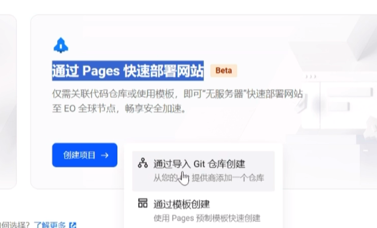 没有账号的话可以先注册一个,通过邮箱就可以注册。注册完成以后进入控制台,找到通过Pages快速部署网站,这里选择导入Git仓库。EdgeOne提供了多种Git仓库可以选择,这里我点击Github。然后我们登录并且授权一下,选到我们刚才上传到Github上面的项目。