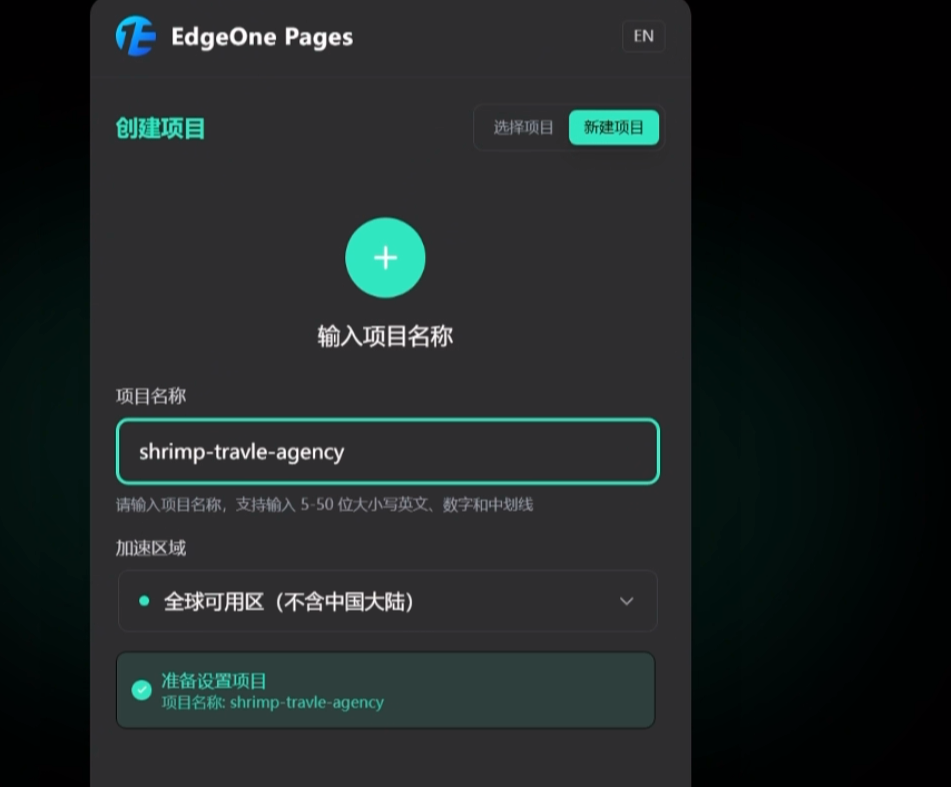 我们回到EdgeOne,创建项目,直接上传,给项目起个名字,然后把压缩包拖拽进来,点击开始部署。.