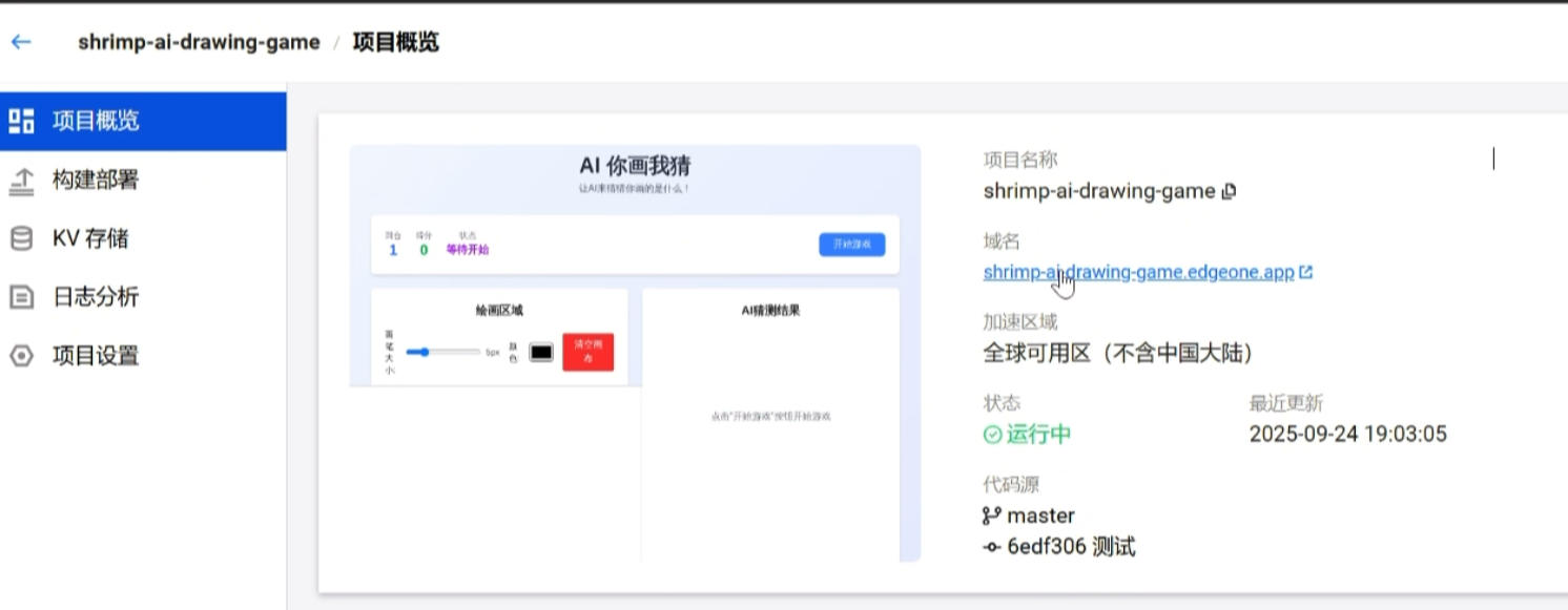 我前段时间用AI做了一个你画我猜的游戏网站,开发框架选用了Next.js 15。项目在后台调用Gemini API完成图形的猜测,如果猜测的结果跟题目一致,就会加分。我们先把这个项目用EdgeOne Pages部署下。