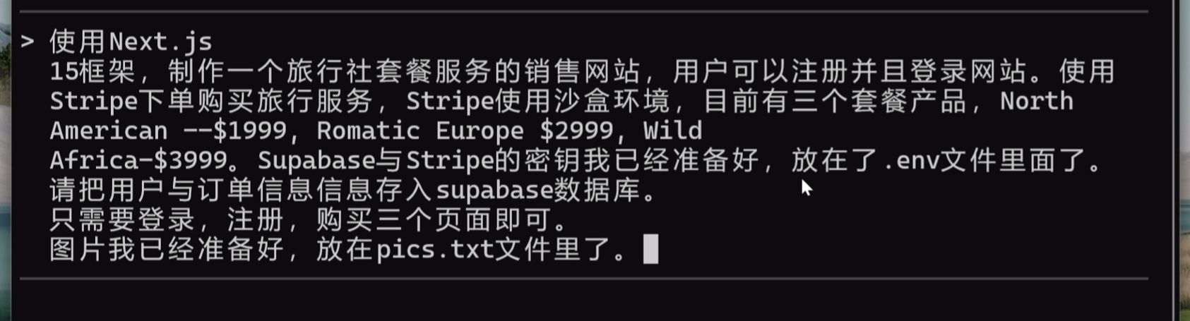 这次我使用EdgeOne MCP工具加AI,把它部署上线。这次我使用的AI编程工具是Claude Code。我的提示词是: 使用Next.js 15框架,制作一个旅行社套餐服务的销售网站。用户可以注册并且登录网站,使用Stripe下单购买服务,把用户与订单信息存入Supabase数据库。只需要登录、注册、购买三个页面。开发过程就略过不看了。我们直接看最后怎么部署。
