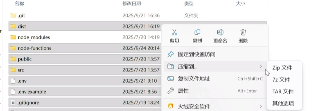 我们来到项目源代码的文件夹,把代码选中一下。注意,不要把这个比黑洞还重的node_modules文件夹打包进去。右键压缩到ZIP文件。