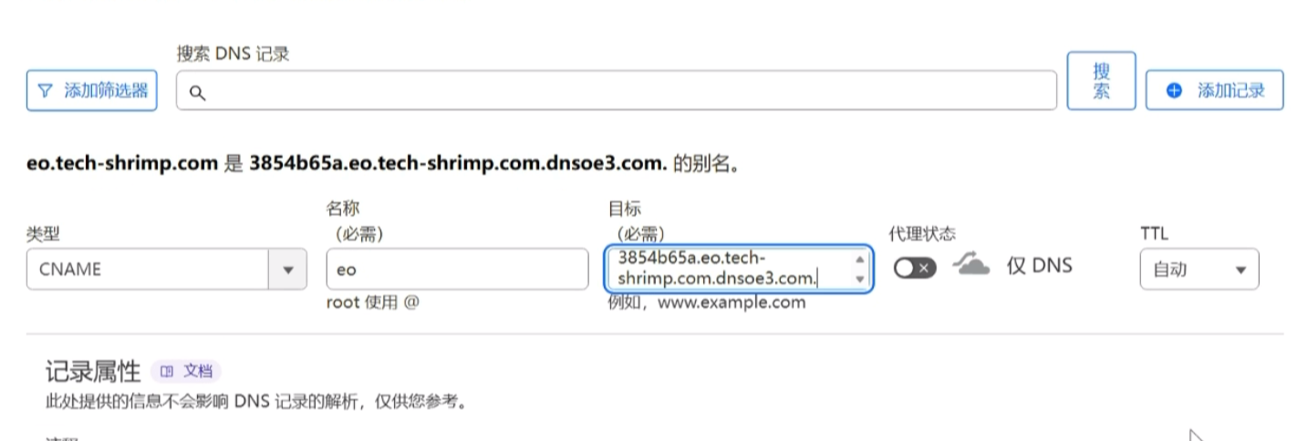 这里我填写一个自己的子域名,点击下一步。这里会生成一个CNAME,我们来到域名的购买网站,找到DNS记录类型选择CNAME,名称eo,目标填写EdgeOne提供的这一串,填写过来保存。