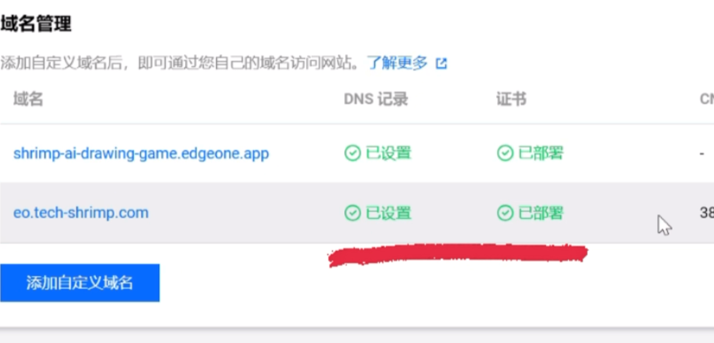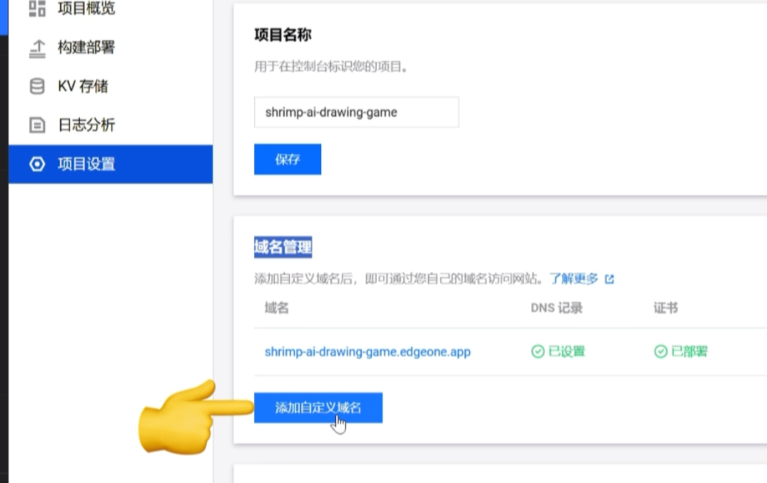 我们来测试下新部署的网站在CDN的加持下的加载速度有多快。首先我们给网站配置一个自定义域名。我们来到项目设置-->域名管理,添加自定义域名