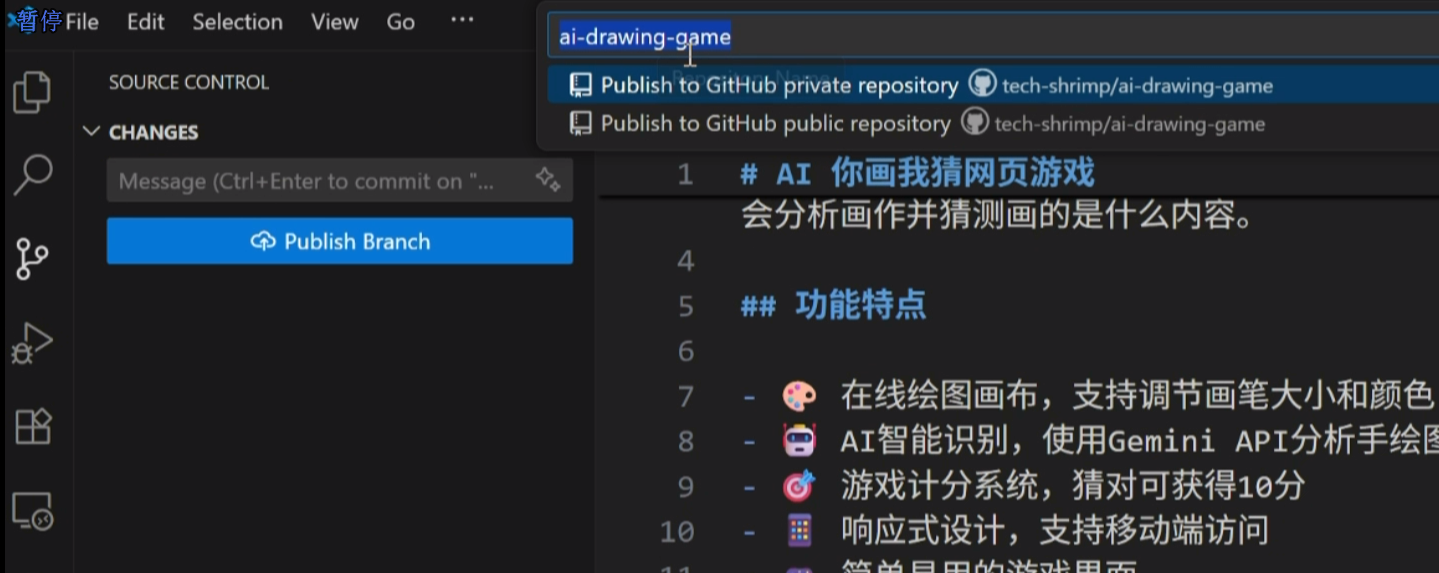 在VScode里面找到Source Control,点击Publish按钮,给项目起个名字,然后点击Publish to GitHub,把代码上传到GitHub上面。