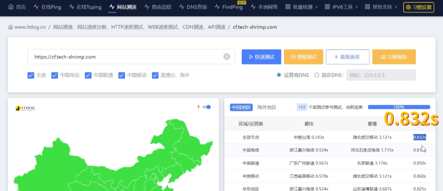 我使用Cloudflare Pages也部署了同样的网站,我们来对比一下它们的速度。我们先看Cloudflare:Cloudflare的平均访问时间在0.83秒。