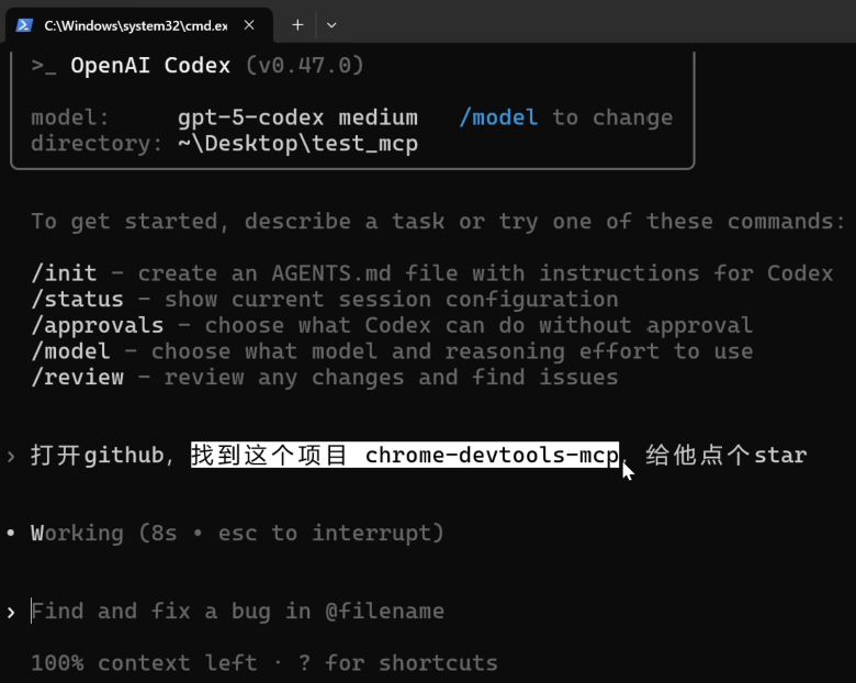 这里我还是回退成Windows,把配置文件保存一下,然后我们还是进入测试文件夹,输入命令Codex,先把Codex启动起来,等待了一会,启动完成,我们输入/mcp,可以看到我们添加的MCP Server,这样在Codex这边就配置完成了。这个MCP的基础用法就是让AI操作浏览器,自动化完成一些操作。我让Codex打开Github,然后找到这个项目,给它点个star。