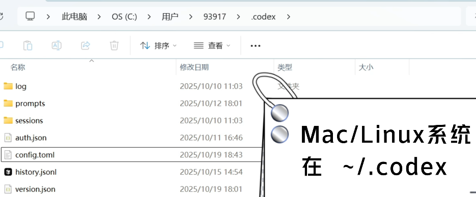 我们来到这个地址C:/用户/{你的用户名}/.codex,进来以后找到这个文件config.toml,如果没有这个文件的话,可以新建一个。苹果电脑或者Linux系统的话,就是这个地址:~/.codex/config.toml 。