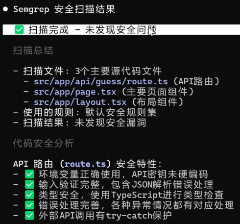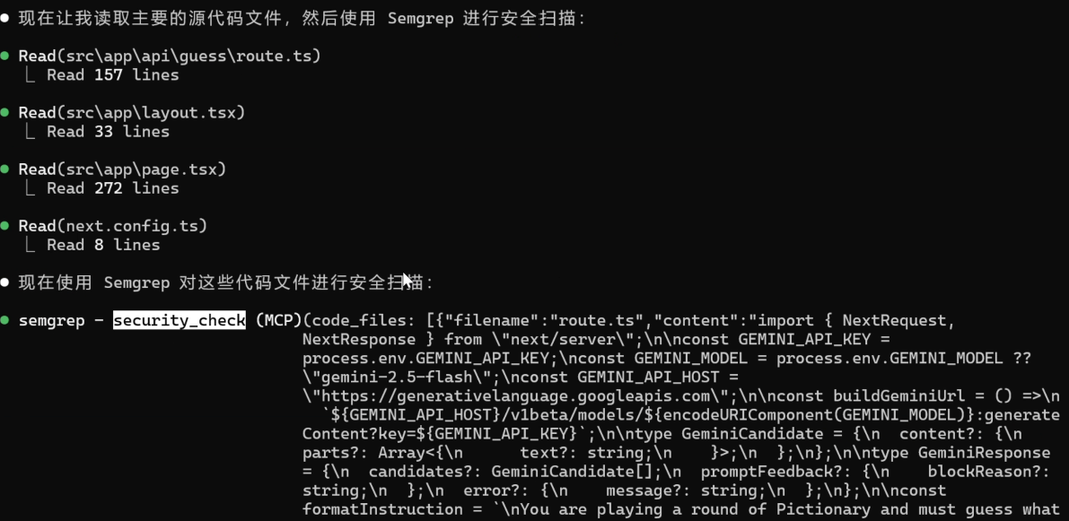 我让他用这个MCP对代码进行安全扫描。我们看到AI调用了MCP工具,对代码进行静态的安全扫描。