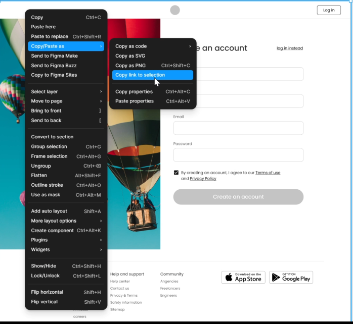 用Next.js 15框架制作一个登录页面,严格遵照这个Figma的设计稿。我们选中这个设计稿的页面,当然也可以选择某个区域,或者某些元素。选中页面,右键copy -> copy link to selection,然后把链接粘贴过来,这样执行。