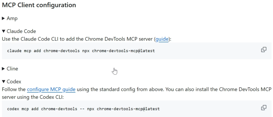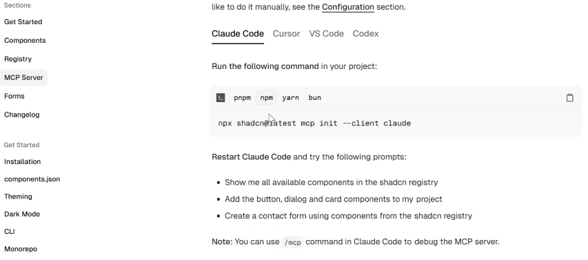 当然我们也可以让AI自动来这边查找,然后把代码给我们复制到项目里面。在左边找到MCP Server,这里面有Claude Code的配置方式。