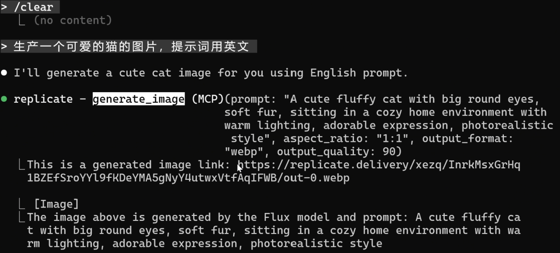 这样就配置成功了。我们启动下Claude Code。我让它生成一个可爱的猫的图片,提示词注意用英文的。