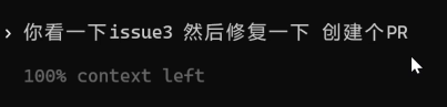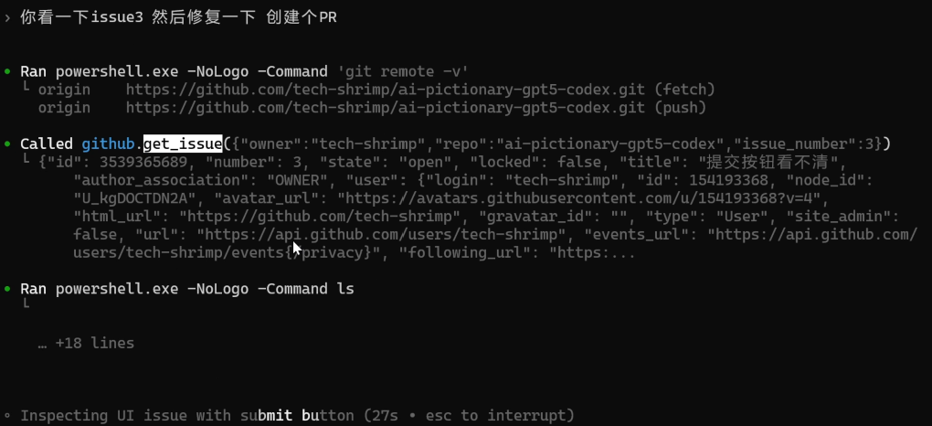 然后代码是在Github上面的,这时候可能下载到我这套代码的人会在上面提一个issue。有人会提交issue,说提交按钮看不清楚。然后我们就可以让AI结合Github MCP自动把这个问题修复。我的提示词是你看一下issue3,然后自动修复一下,创建一个pull request。