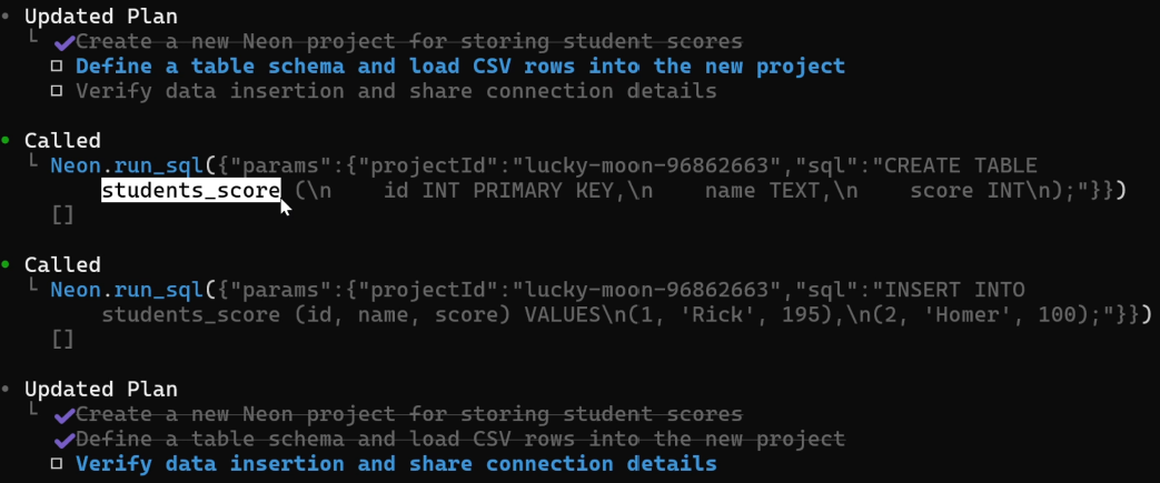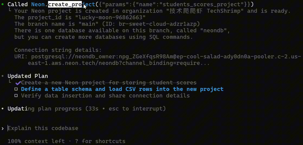 Codex调用了Neon MCP,先新建了一个project,然后执行SQL语句,把表建出来了。