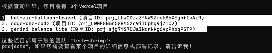 页面都成功显示出来了,部署完成。除了部署项目Vercel MCP,还可以用来查找信息。比如我问他我有哪些Vercel项目,他先调用MCP工具,获取到我的团队信息,然后查找这个团队下面所有的项目,最终查找到了这三个项目,是完全正确的。
