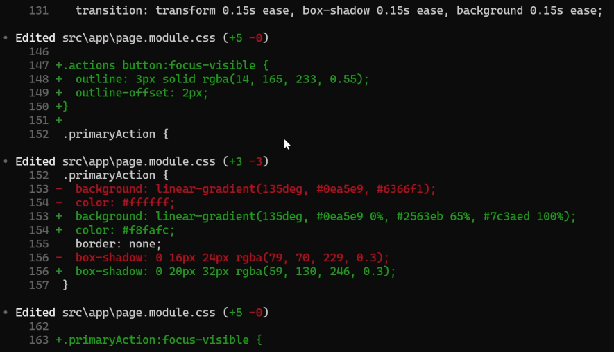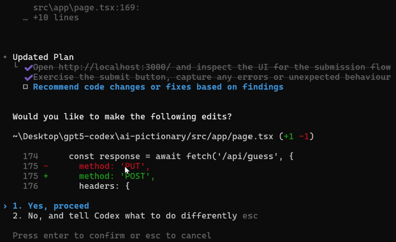 我们看到AI触发了测试,并且控制台已经有了报错,他通过MCP工具读取到控制台信息,还有网络请求,然后Codex在代码里面找到了报错原因,应该把这个put请求改成post,这样使用Chrome dev tools MCP成功进行了页面的调试,并且精准地修改好了代码,非常的方便。