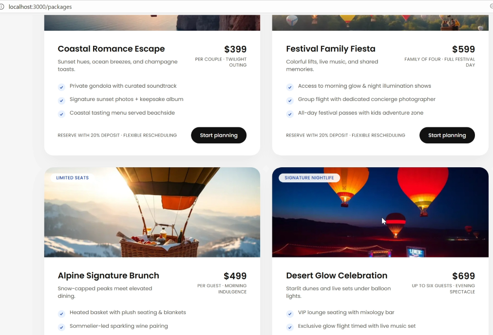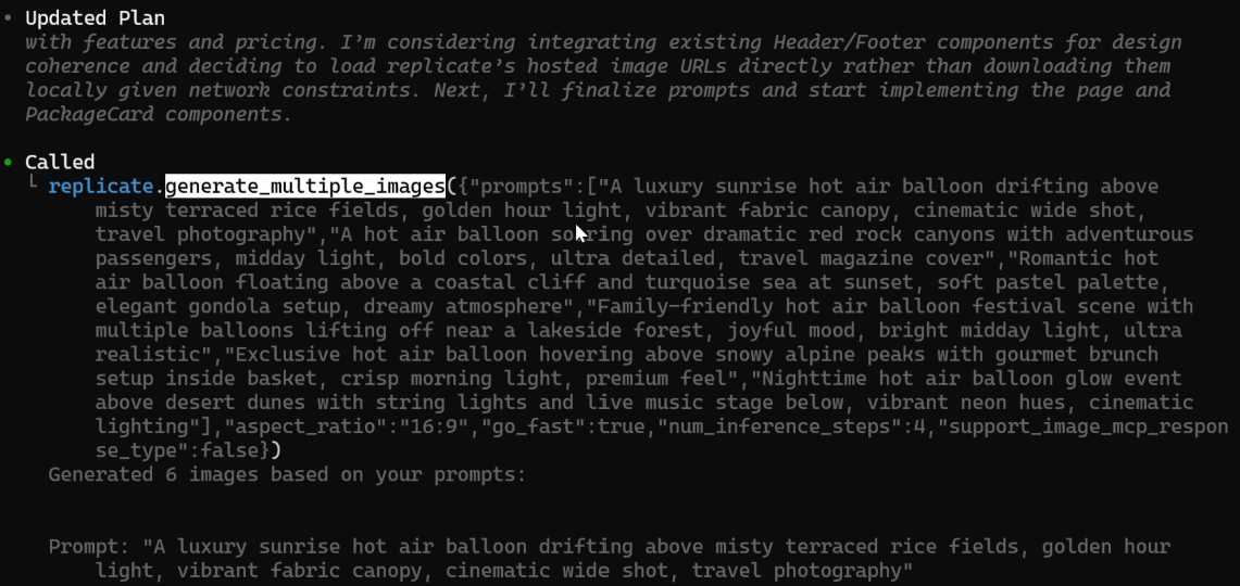 我们来看一个实际案例,给这个热气球网站新建一个销售套餐网页,设计6个套餐可供选择,图片调用Replicate生成,后端可以先不用实现。AI开始编写代码了,这里它调用了Replicate MCP工具,