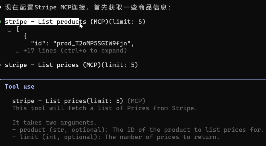 然后进入Claude Code,/mcp,这里登录一下,在浏览器点击授权。我的提示词是,用Next.js创建一个商品支付页面,商品信息用MCP从Stripe获取,只实现基础的支付功能即可,无需复杂的后台逻辑。AI调用了Stripe MCP获取了商品的信息,