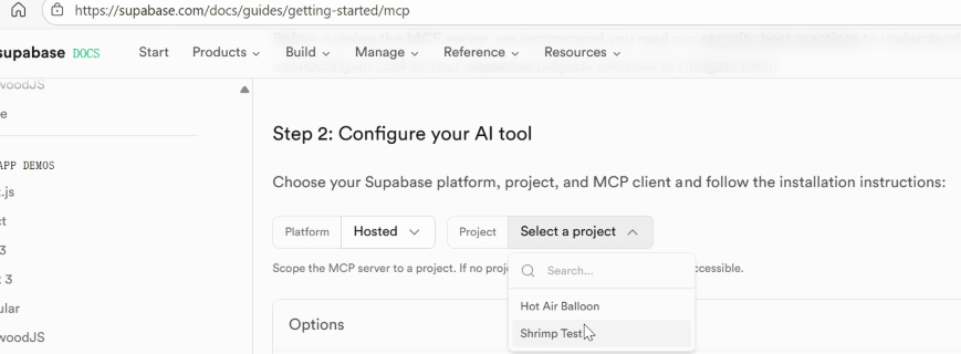 我们来把Supabase的MCP也配置一下。我们先来到Supabase的控制台,创建一个新的项目,给项目起个名字,填个密码,点击创建。我们来到Supabase的文档站,在project这里选择我们刚才建的项目。