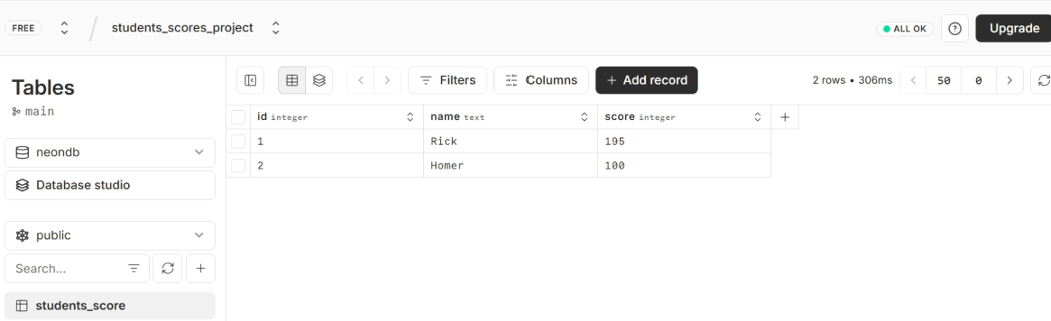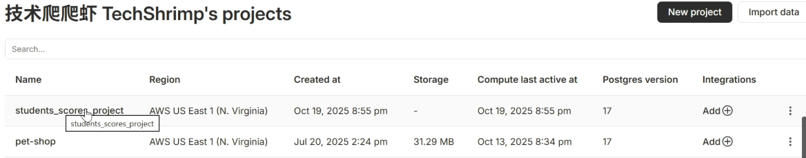把数据插入了表里面。我们来到Neon的控制台,就可以看到刚才新建的project,在project里面,就可以看到我们的数据表。
