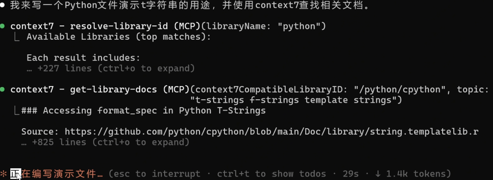 也就是让AI在编码之前,先用context7 MCP查找文档。我们看到AI调用context 7 MCP,成功查找到了一些文档,然后开始编写代码。