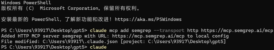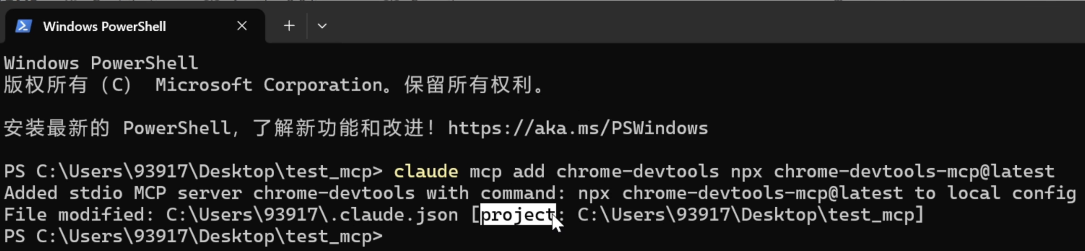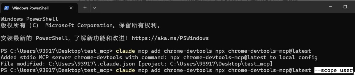 它默认是项目级别的,只对当前这个项目生效;如果想对所有的项目生效,可以在后面加两个--scope user,添加了这个参数以后,这个MCP就变成了用户级,这个电脑上的所有项目都会生效。