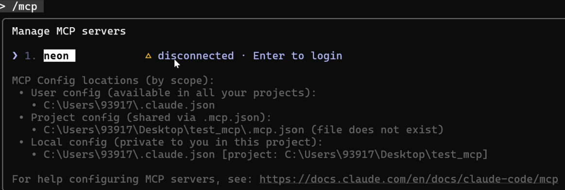 配置新的MCP Server之前,我先把旧的移除掉。MCP Server不是配置越多越好,每配置一个MCP Server都会增加一部分的上下文占用,所以MCP Server最好是用哪个配置哪个。输入claude mcp list,这里列出的是之前装过的MCP。我把上一个移除掉,输入命令claude mcp remove,然后粘贴上MCP的名字,这样就移除干净了。我们把Neon的这个命令复制过来,添加进去,再启动下claude,输入/mcp,这里显示Neon的需要登录授权一下。