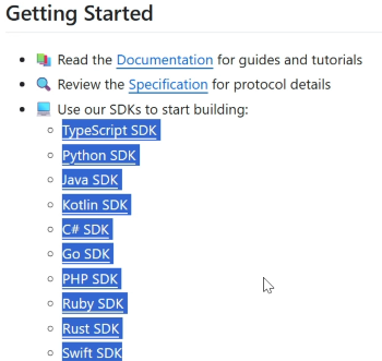 终于我们来到了视频的最后第15个MCP,这里我不准备介绍具体的MCP Server了。我们看的是GitHub MCP的官方仓库,https://github.com/modelcontextprotocol,这里面提供了很多的SDK,