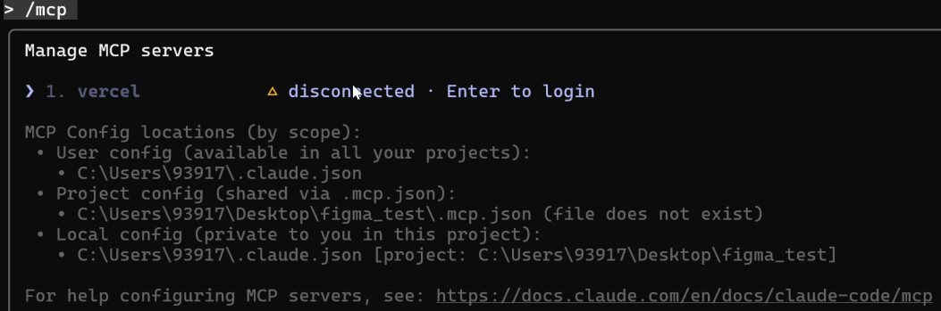 这里有Claude Code的配置方式,把这个配置命令复制一下,把命令粘贴过来回车。我们启动一下Claude Code,/mcp,这里Vercel的MCP需要先登录一下,