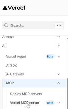 代码写好了,现在需要一个平台快速把它部署上线。Vercel就是一个免费提供项目部署的平台。Next.js就是由Vercel开发维护的框架,我们使用Next.js开发的這個热气球网站跟Vercel平台是绝配。接下来我们就使用Vercel的MCP,一句话把它部署上线。我们来到Vercel 的文档站,https://vercel.com/docs,这里搜索MCP,在左侧找到Vercel MCP Server。