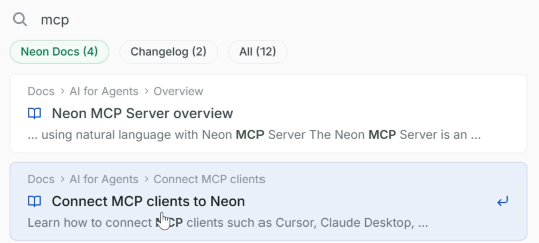 Neon是一个基于Postgres封装的免费的云端数据库。 https://neon.com 我们接入它的MCP,就可以让AI瞬间获得一个免费的云端数据库。这里找到Docs,然后搜索MCP,找到这个文档Connect MCP,里面列出了各个客户端的配置方式。
