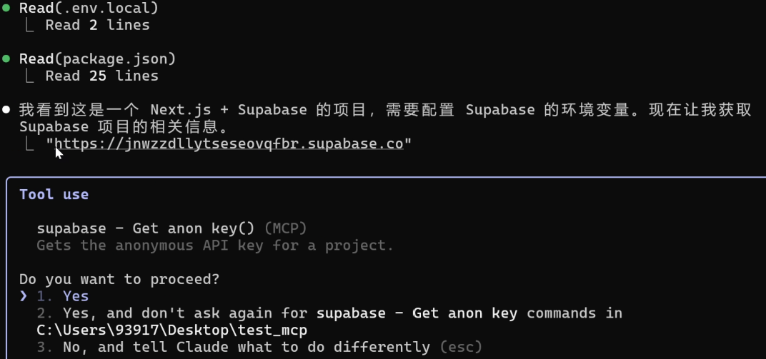 项目里需要配置两个环境变量,一个是URL,还有一个Key。这个完全可以使用MCP自动生成一个。我跟AI说一下,你用MCP把环境变量填一下。这里他成功调用了MCP,帮我们填写好了URL,还有API Key。