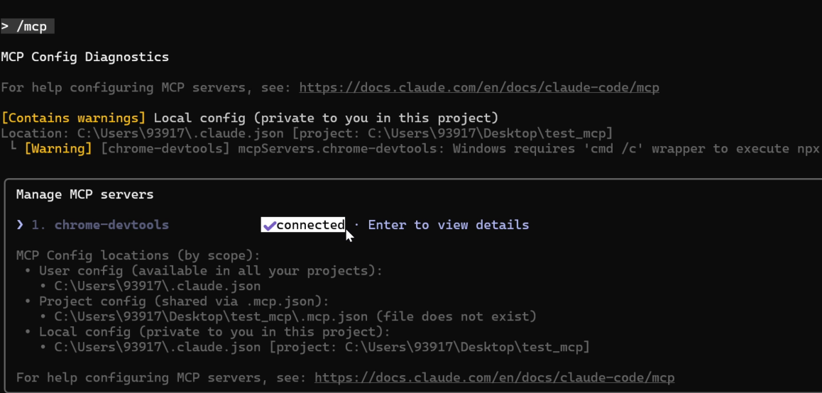 安装完成以后,我们启动一下Claude Code,然后输入这个命令/mcp,回车这里打上一个对勾,显示connected,就配置完成了。