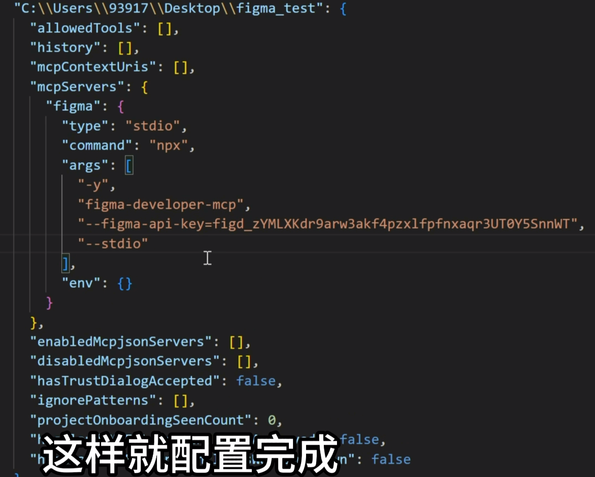 把API Key复制一下,填写到配置文件里面,打个逗号,还有最后一个参数,也就是--stdio。这样就配置完成。