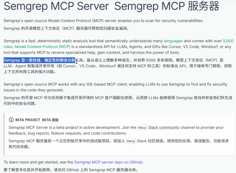 我们使用AI写代码,最不放心的就是它的安全性。Semgrep MCP可以帮助我们进行安全漏洞的扫描。https://semgrep.dev/docs/mcp?utm_source=chatgpt.com,它是一个安全静态分析工具,内置了5,000多条安全规则。