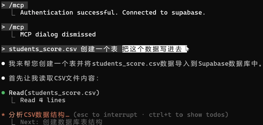 回车启动一下Claude Code,输入/mcp,选择Supabase,回车,在浏览器打开的窗口下面点击授权,这样就配置完成了。我还是让他创建一个表,把这个数据写进去,